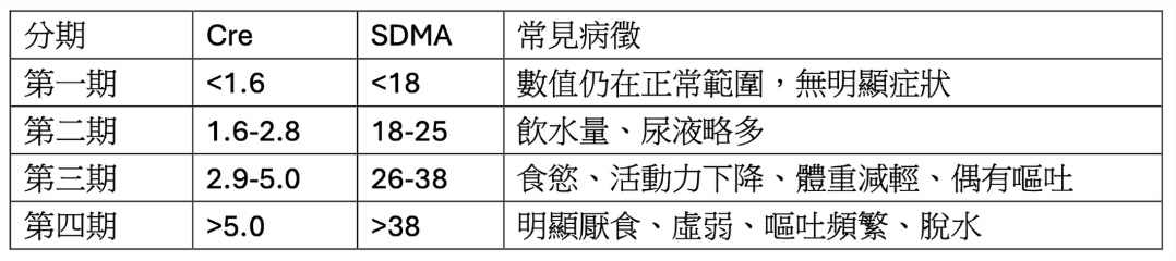 *貓咪慢性腎臟病(CKD)通常使用國際腎臟學會(IRIS)分期,依據肌酸酐(Cre)或SDMA數值分為四期,反映病程由輕至重。
